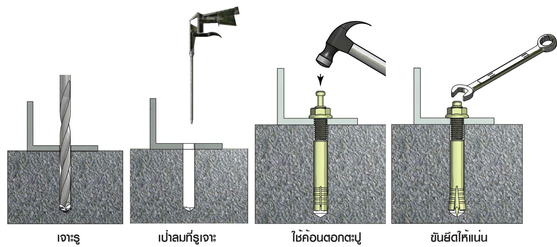 - วางวัตถุที่จะติดตั้งตรงตําแหน่งที่ต้องการ แล้วเจาะรูคอนกรีตผ่านรูของวัตถุที่จะยึดแล้วพยายามคว้านรูให้กว้างกว่าด้านบน