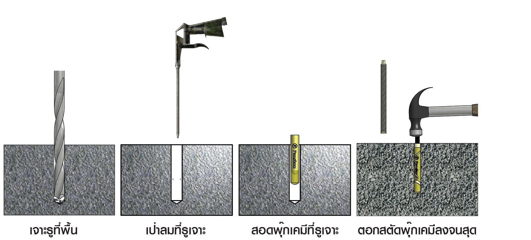 • ล้างและทําความสะอาดรูคอนกรีตให้สะอาดที่สุดด้วยแปรงและใช้ลมเป่าให้รูสะอาดไร้ฝุ่นละออง