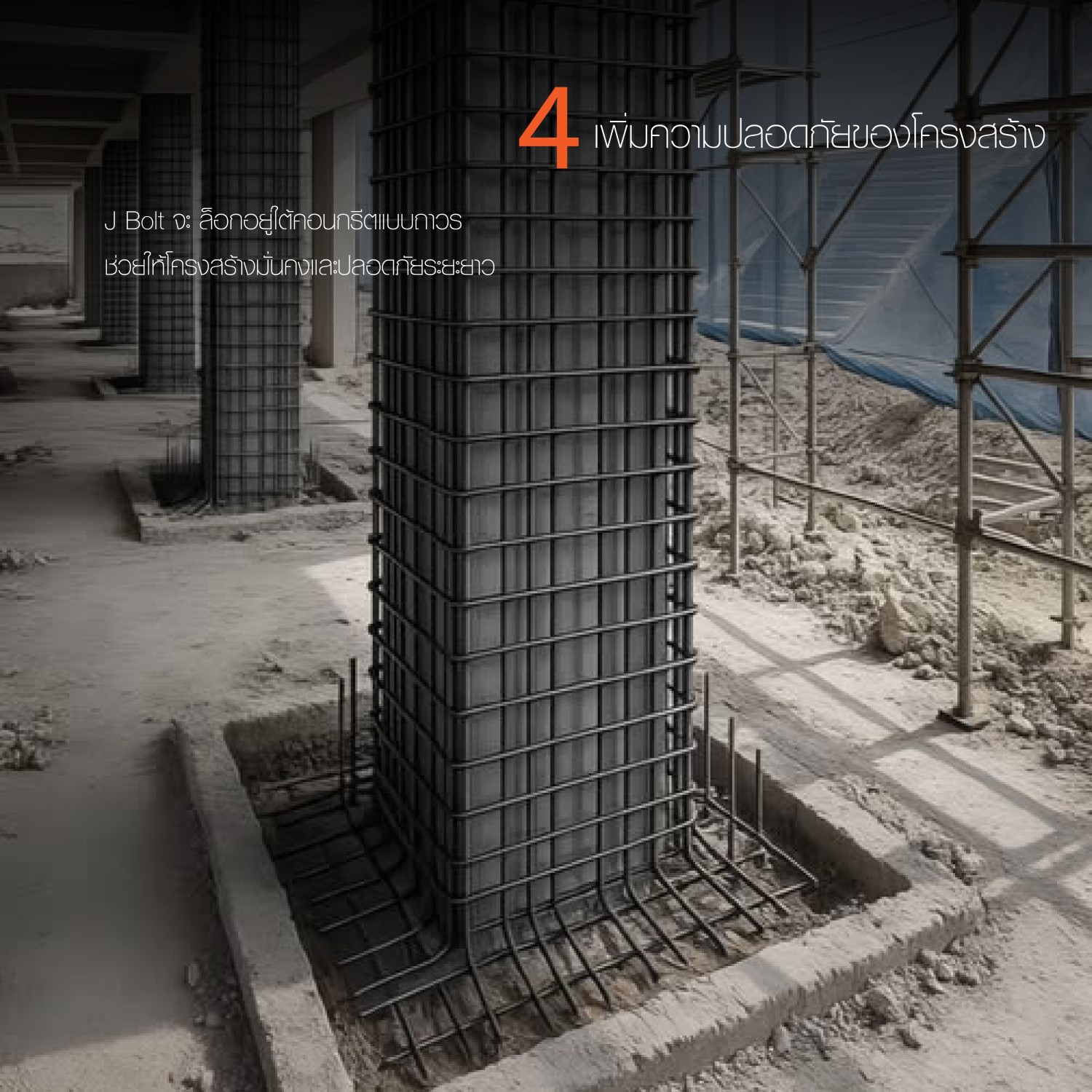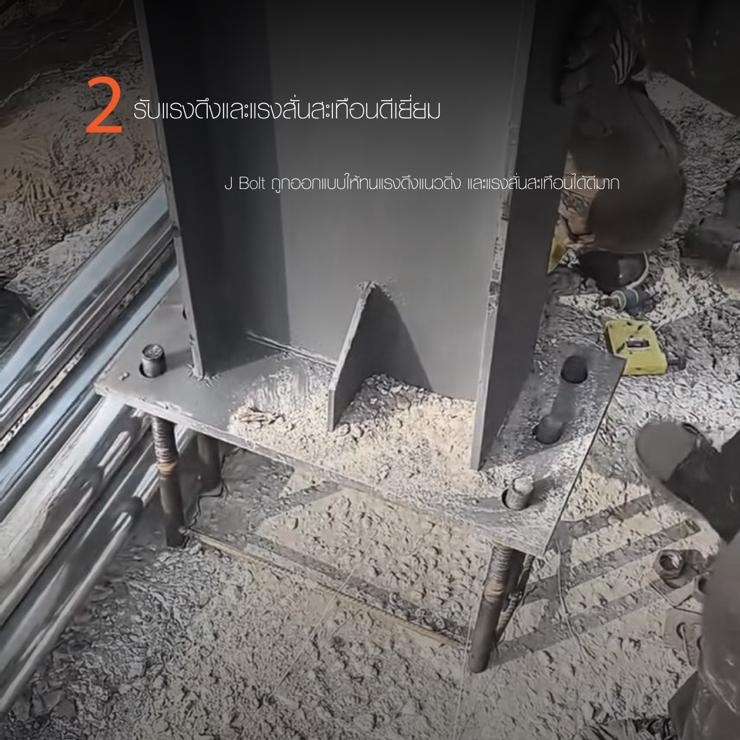 ถ้าใช้สกรูทั่วไป อาจมีโอกาสหลุดหรือดึงหลุดจากพื้นได้ แต่ J Bolt จะ ล็อกอยู่ใต้คอนกรีตแบบถาวร ช่วยให้โครงสร้างมั่นคงและปลอดภัยระยะยาว