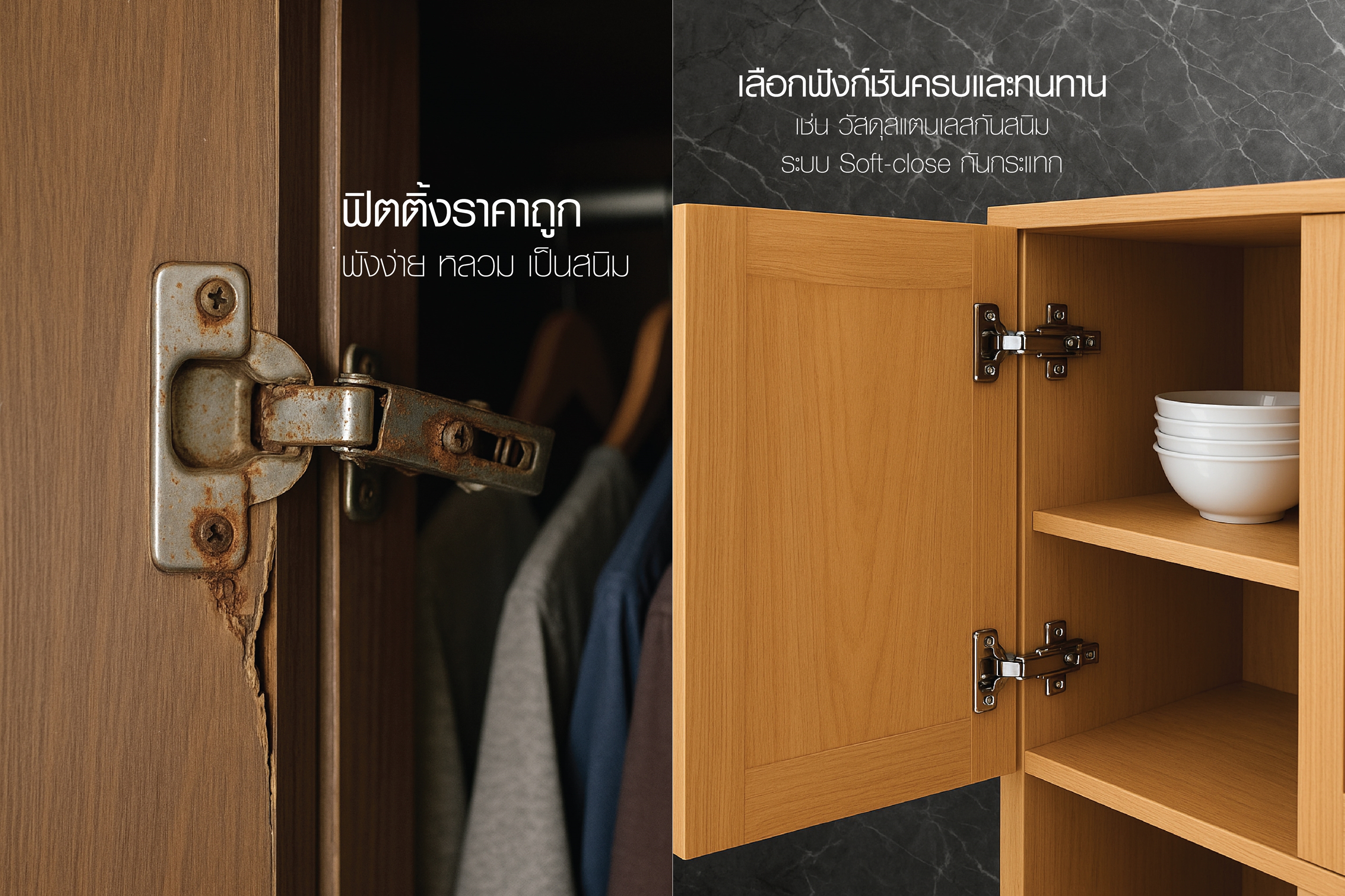 – ใช้ระบบ Soft Close เพื่อให้เปิด–ปิดนุ่มนวล ไม่กระแทก