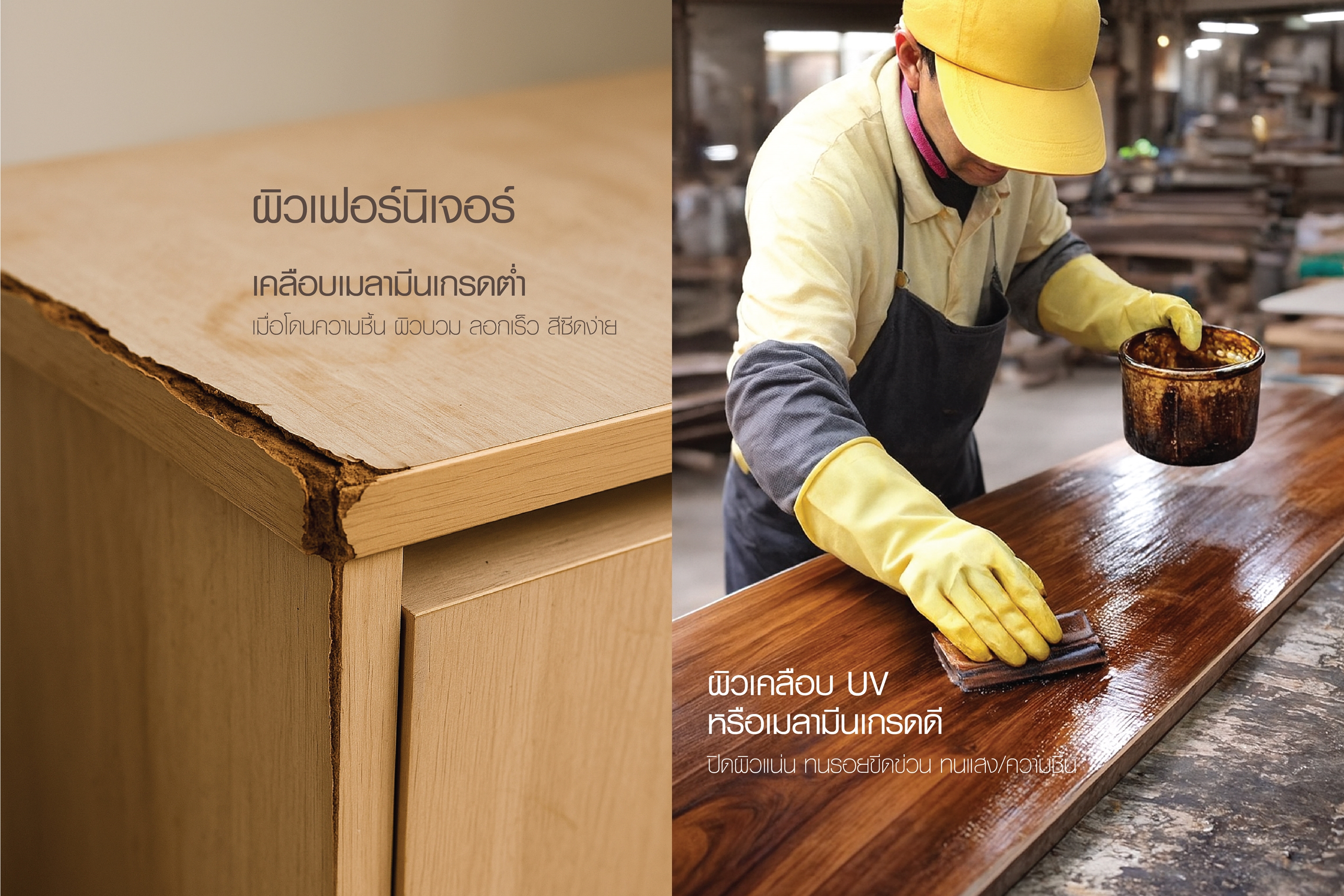 – ใช้ลามิเนตหรือเมลามีนเกรดดีที่มีความหนาและปิดผิวแน่น