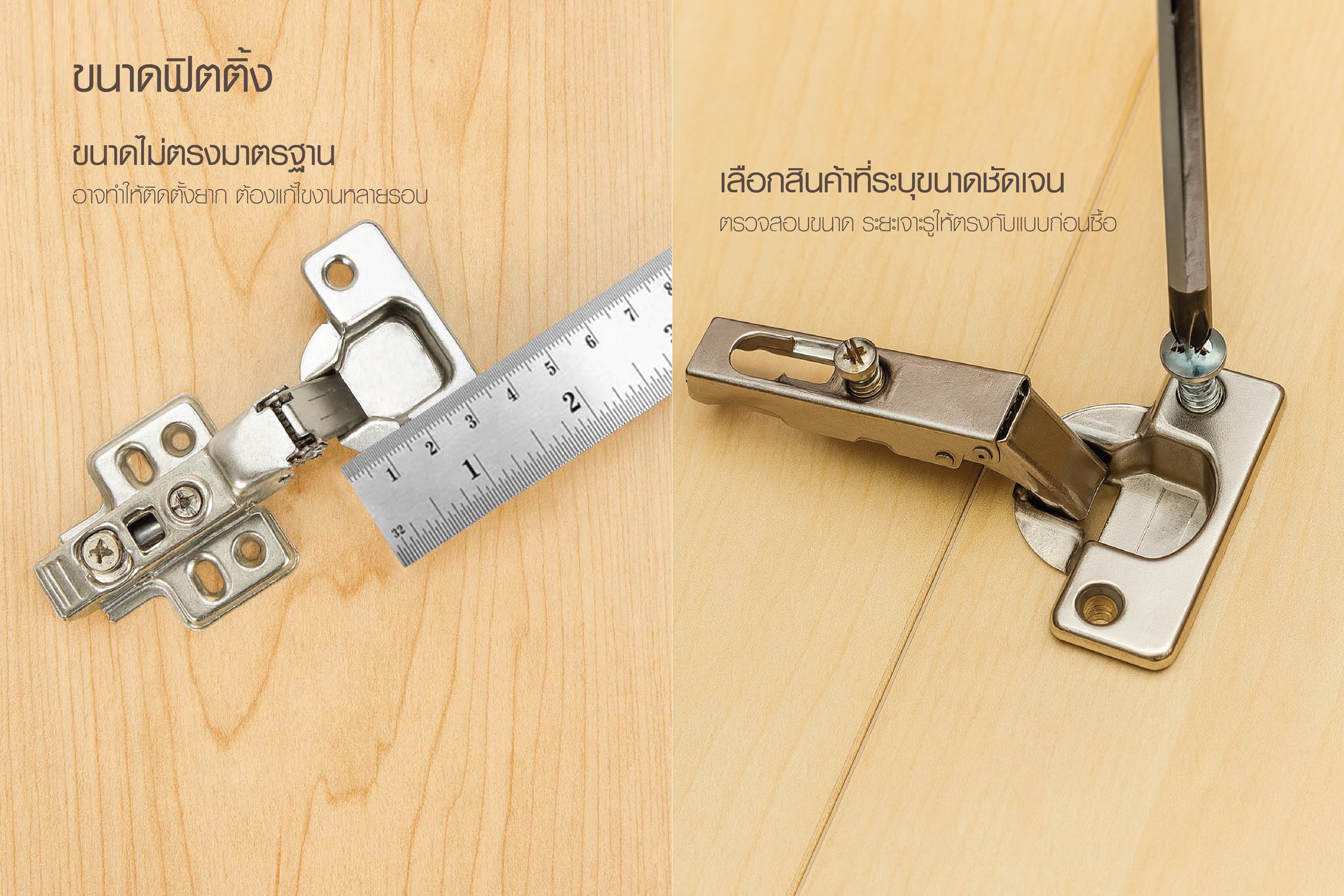 – ตรวจสอบขนาดราง บานพับ และระยะเจาะรูให้ตรงกับแบบก่อนซื้อ