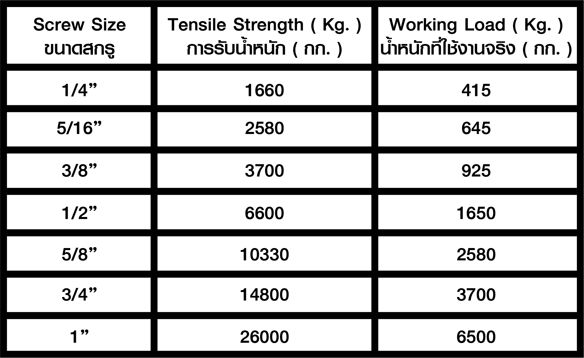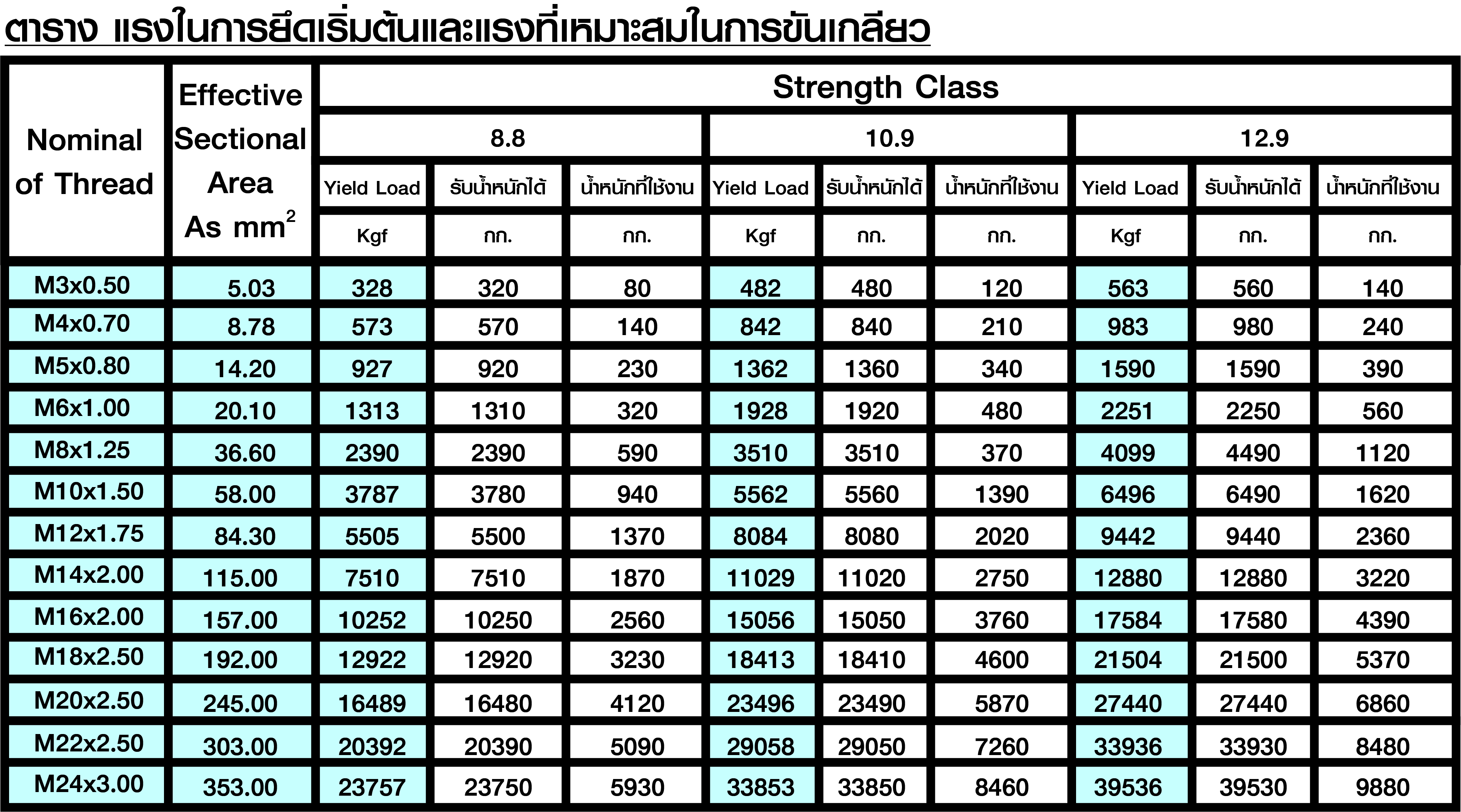 ตารางการรับน้ำหนักของสกรูน็อตแข็ง