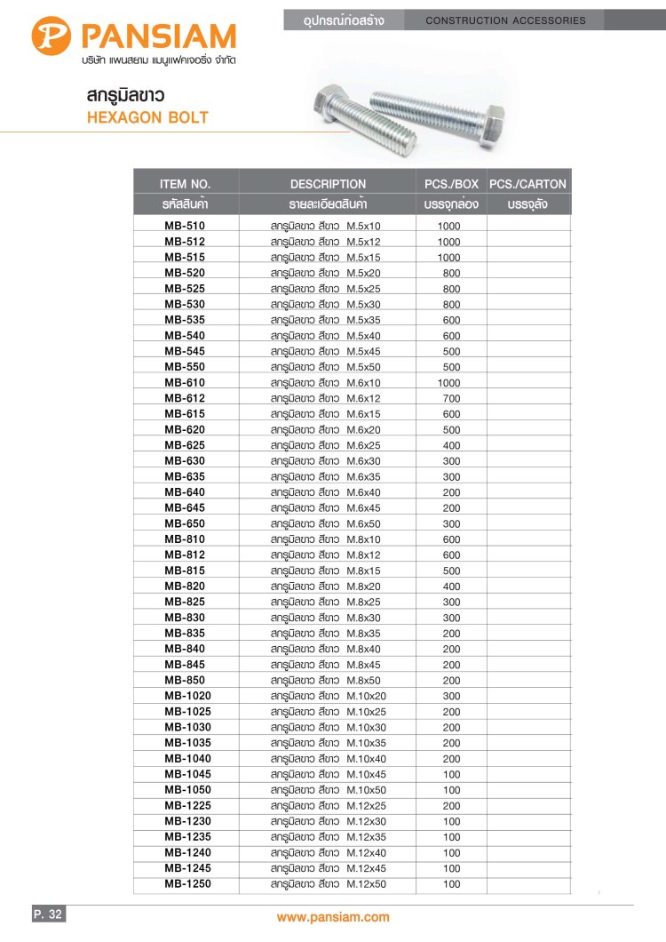 สกรูหัวหกเหลี่ยมมิลขาว