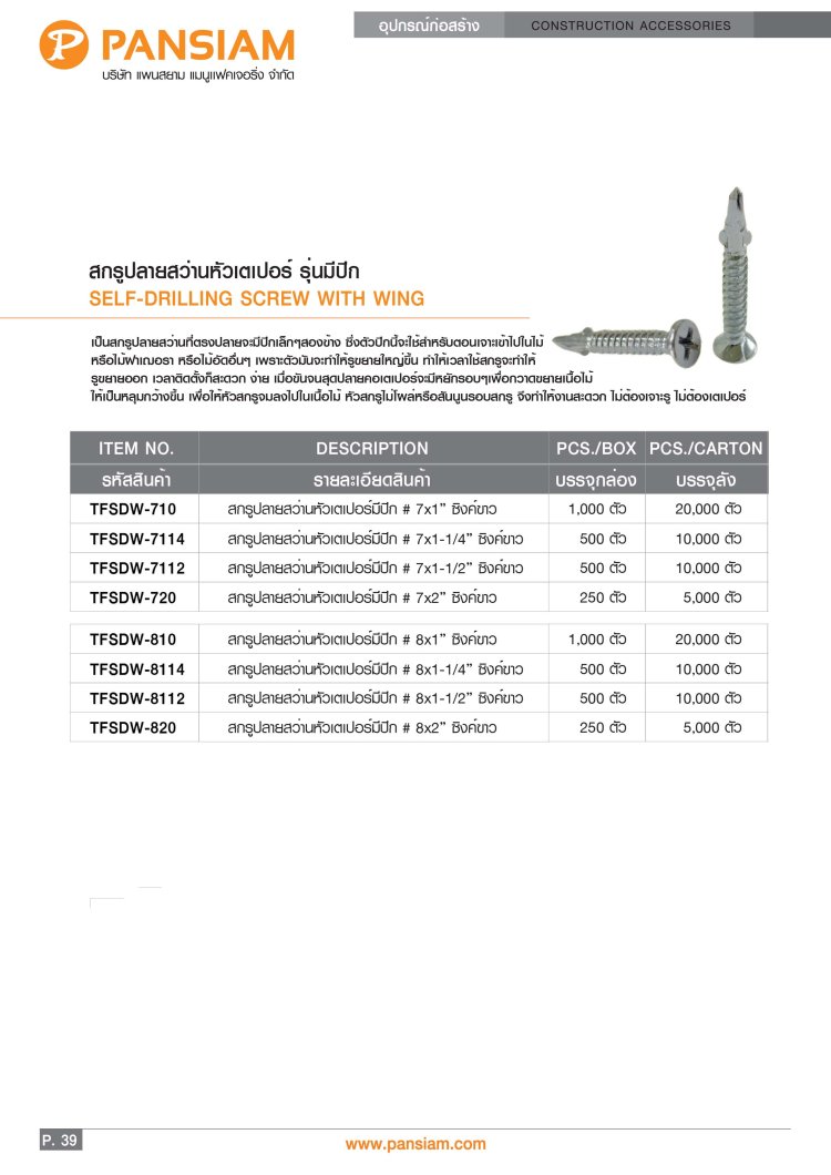 สกรูปลายสว่านหัวเตเปอร์ รุ่นมีปีก